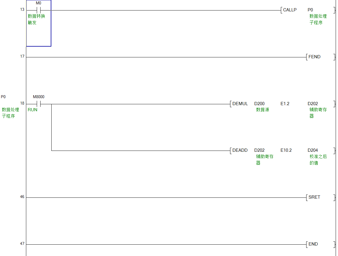 舉例說明:某工程項(xiàng)目中,需要對多組數(shù)據(jù)進(jìn)行如下處理:D204=D200*1.2+10.2;D200為輸入的待處理數(shù)據(jù),D204為處理完成后的數(shù)據(jù)值。M0為進(jìn)入處理程序的觸發(fā)條件。