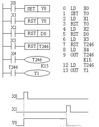 2)只有當(dāng) X1 的常開閉合時, Y0 才變?yōu)?OFF 狀態(tài)并保持,即使 X1 常開斷開, Y0 也仍為 OFF 狀態(tài)。
