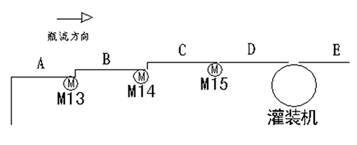 變頻器1﹑2﹑3的調(diào)速方式為兩種:1.來自灌裝機(jī)主機(jī)變頻器的模擬信號(hào)DC0~10V,經(jīng)過隔離器轉(zhuǎn)換為線性DC0~10V,再經(jīng)過電位器分壓作為變頻器1﹑2﹑3 的給定信號(hào),以控制電機(jī)M13﹑M14﹑M15,這樣可以做到輸送帶與灌裝機(jī)的速度很好匹配;2.采用多段速控制端子SD﹑STF﹑RL﹑RM﹑RH,通過PLC編程,由PLC發(fā)出控制信號(hào)以控制速度。PLC根據(jù)灌裝機(jī)操作臺(tái)發(fā)出的信號(hào)來判斷使用那種速度控制方式,又根據(jù)瓶流情況選擇高低速。在模擬信號(hào)控制時(shí)是通過輔助繼電器KA1和KA2,KA3和KA4,KA5和KA6的組合,經(jīng)W1﹑W2,W3﹑W4,W5﹑W6分壓控制變頻器輸出速度。在多段速時(shí)通過PLC的輸出Y10﹑Y11﹑Y12﹑Y13,Y20﹑Y21﹑Y22﹑Y23,Y24﹑Y25﹑Y26﹑Y27分別調(diào)節(jié)各個(gè)變頻器的輸出頻率以達(dá)到多段輸送帶的速度匹配及與灌裝機(jī)的速度匹配。在模擬控制方式調(diào)整中,電位器分壓比的調(diào)整是個(gè)關(guān)鍵,通過生產(chǎn)調(diào)試中摸索,終于找到了比較好的速度匹配。分壓比一旦調(diào)好,不得隨意改動(dòng)。