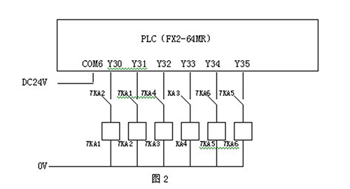 變頻器1﹑2﹑3分別控制電機(jī)M13﹑M14﹑M15,主回路接線圖略。PLC為FX2-64MR。FMA﹑11是來自灌裝機(jī)變頻器0~10V的輸出信號(hào),經(jīng)過信號(hào)隔離器的轉(zhuǎn)換作為變頻器1﹑2﹑3的控制信號(hào)。圖中KA1-6為輔助繼電器。W1-6為分壓電位器。PLC的輸入端子略。FMA﹑11是來自灌裝機(jī)主機(jī)變頻器的輸出信號(hào)。兩圖中的PLC為同一PLC,圖2中的COM6接DC24V電壓,控制輔助繼電器。