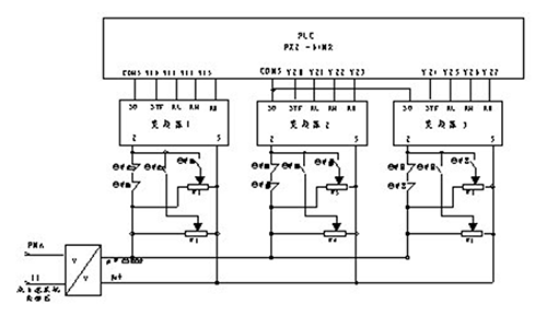 深圳某啤酒生產(chǎn)廠使用三菱變頻器FR-A540E為主要核心設(shè)備對該廠灌裝生產(chǎn)線輸瓶帶的調(diào)速要求進(jìn)行部署。三菱變頻器外部端子調(diào)速可分為模擬量調(diào)速和多段速調(diào)速。模擬量調(diào)速可用電壓DC0~10V或電流DC4~20mA,進(jìn)行無級(jí)調(diào)速。我廠用0~10V模擬電壓作為給定量 ,進(jìn)行開環(huán)調(diào)速??;多段速采用外部輸入端子 SD﹑STF﹑RL﹑ RM﹑RH,進(jìn)行三段速調(diào)速。RL﹑RM﹑RH是低﹑中﹑高三段速速度選擇端子,SD是輸入公共端,STF是啟動(dòng)正轉(zhuǎn)信號(hào)。如圖3中,當(dāng)Y10,Y11有輸出時(shí),變頻器為低速運(yùn)行;當(dāng)Y10,Y12有輸出時(shí),為中速運(yùn)行;當(dāng)Y10,Y13有輸出時(shí)為高速運(yùn)行。變頻器2﹑3原理與此相同。三段速分別設(shè)置為15Hz﹑30Hz﹑45Hz。在模擬量調(diào)速時(shí),通過調(diào)整W1﹑W2的分壓比設(shè)置KA1閉合時(shí)變頻器高速運(yùn)行,KA2閉合時(shí)為低速運(yùn)行,當(dāng)KA1﹑KA2都斷開時(shí),變頻器為最高速;變頻器2﹑3原理與此相同。通過編程,PLC根據(jù)操作臺(tái)發(fā)出的信號(hào),選擇控制方式:模擬量調(diào)速或多段速調(diào)速。三菱變頻器的多段速調(diào)速比模擬量調(diào)速有較高優(yōu)先級(jí)(1)。