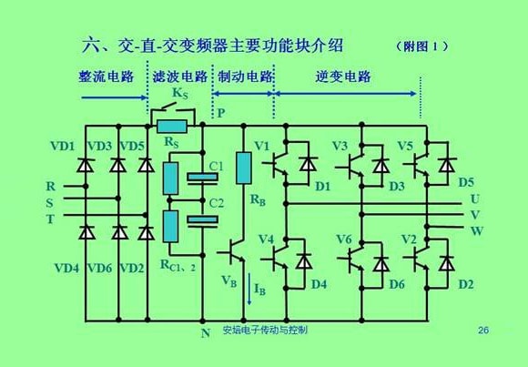 現(xiàn)主要介紹電壓型變頻器結(jié)構(gòu)及原理,電壓型變頻器主電路包括:整流電路、中間直流電路、逆變電路三部分組,交-直-交型變頻器結(jié)構(gòu)見附圖1