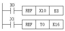 (1)輸入輸出刷新指令REF REF(P)指令的編號為FNC50。三菱FX系列plc采用集中輸入輸出的方式。如果需要最新的輸入信息以及希望立即輸出結(jié)果則必須使用該指令。如圖1所示,當(dāng)X0接通時(shí),X10~X17共8點(diǎn)將被刷新;當(dāng)X1接通時(shí),則Y0~Y7、Y10~Y17、共16點(diǎn)輸出將被刷新。