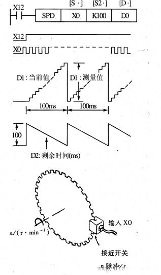 速度檢測指令SPD的編號為FNC56。它的功能是用來檢測給定時(shí)間內(nèi)從編碼器輸入的脈沖個(gè)數(shù),并計(jì)算出速度。如圖5所示,[D. ]占三個(gè)目標(biāo)元件。當(dāng)X12為ON時(shí),用D1對X0的輸入上升沿計(jì)數(shù),100ms后計(jì)數(shù)結(jié)果送入D0,D1復(fù)位,D1重新開始對X0計(jì)數(shù)。D2在計(jì)數(shù)結(jié)束后計(jì)算剩余時(shí)間。