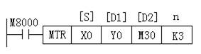 (3)矩陣輸入指令MTR MTR指令的編號為FNC52。利用MTR可以構(gòu)成連續(xù)排列的8點(diǎn)輸入與n點(diǎn)輸出組成的8列n行的輸入矩陣。如圖3所示,由[S]指定的輸入X0~X7共8點(diǎn)與n點(diǎn)輸出Y0、Y1、Y2(n=3)組成一個(gè)輸入矩陣。PLC在運(yùn)行時(shí)執(zhí)行MTR指令,當(dāng)Y0為ON時(shí),讀入第一行的輸入數(shù)據(jù),存入M30~M37中;Y1為ON時(shí)讀入第二行的輸入狀態(tài),存入M40~M47。其余類推,反復(fù)執(zhí)行。
