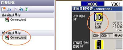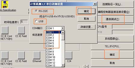 編程電纜插傳統(tǒng)的圓孔時(shí),連接目標(biāo)設(shè)置選擇 RS-232C,并且要選擇相應(yīng)的 COM 口編程電纜插迷你 USB 口時(shí),連接目標(biāo)設(shè)置選擇 USB。