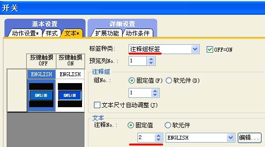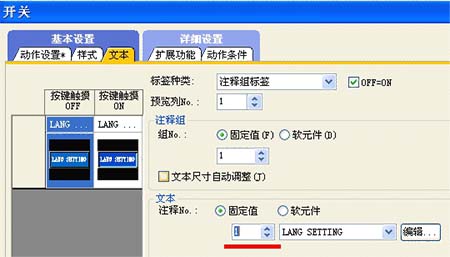 我們在窗口畫面中加入兩個開關(guān)做語言切換和一個返回開關(guān)。開關(guān)的建立和第一個開關(guān)建立相似,標(biāo)簽種類都為注釋組標(biāo)簽,動作都設(shè)為點動。軟元件名分別為 M10、M11、M12。文本注釋 NO 的固定值分別為 2、3、4。