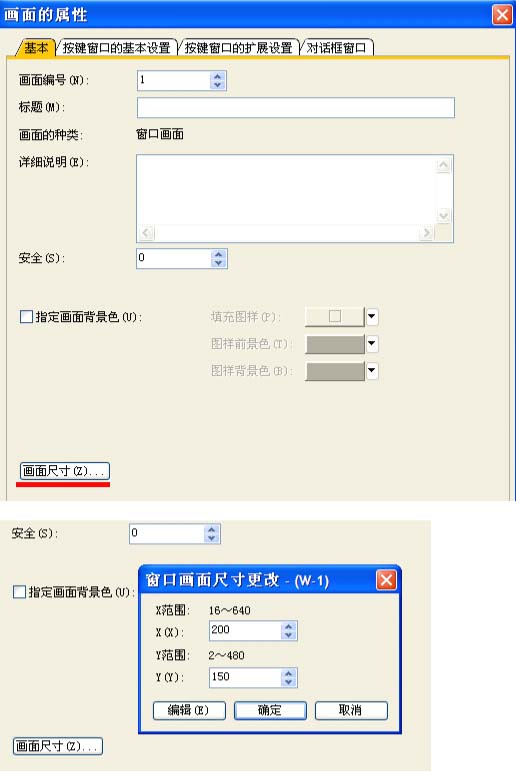 在畫面的屬性對話框中,標(biāo)題可以不填寫。其它地方不做修改,只需把畫面尺寸改小一點。