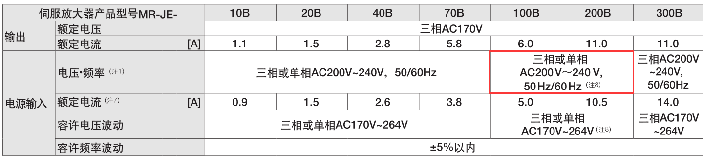 ②只有三菱伺服電機(jī)MR-JE系列有這個(gè)說明,J2S,J3,J4系列大于750W都需要三相220V。