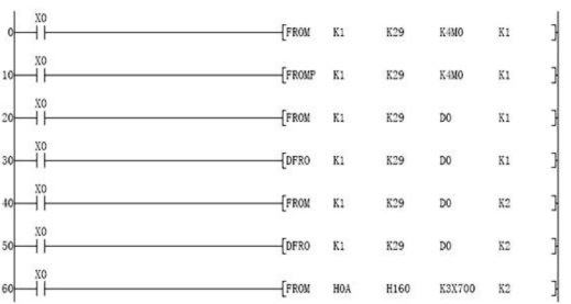 0行:當X0=1時,讀取1號(第1個K1)三菱PLC模塊緩沖區(qū)地址29(K29)的數(shù)據(jù)保存到M0~M15的16點(K4)中間繼電器中。