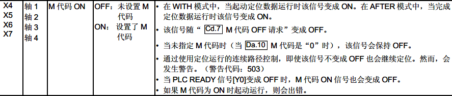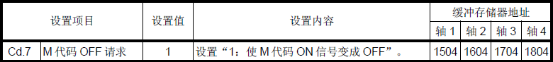 當M代碼ON 信號(X4、X5、X6、X7)為ON 時,必須通過順控程序使它變成OFF。為了使M代碼ON 信號變成OFF,在“ Cd.7 M 代碼OFF 請求”中設(shè)置“1”。