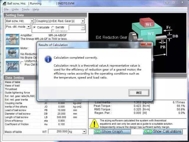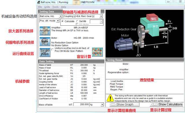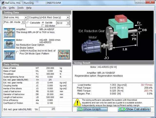 若計(jì)算出錯(cuò),或者所選伺服放大器/電機(jī)無(wú)法匹配,會(huì)出現(xiàn)以下畫(huà)面,在選型結(jié)果處顯示相關(guān)信息,不符合要求的參數(shù)紅字表示。