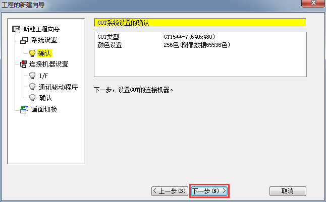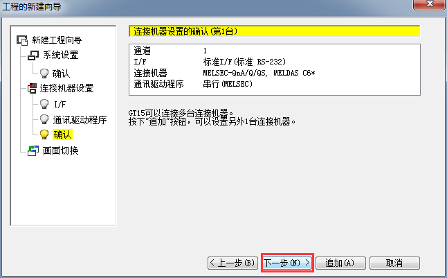 2.1.7 連接機器設(shè)置確認,確認機種連接參數(shù)設(shè)置,單擊[下一步]