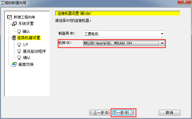 2.1.4 設(shè)置連接機種類型,需根據(jù)機種選擇,后單擊[下一步]