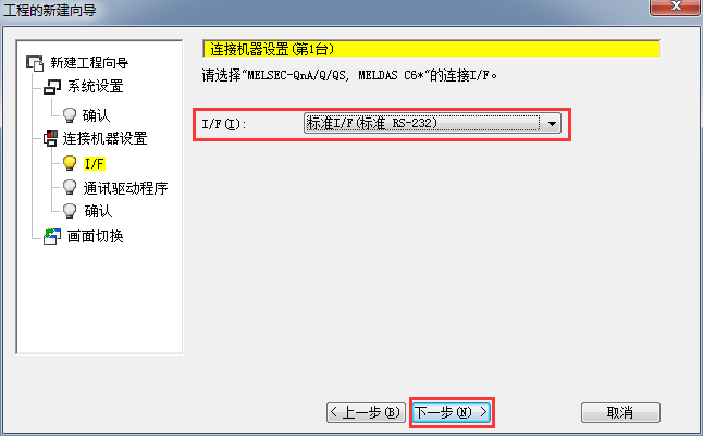 2.1.5 設(shè)置I/F端連接設(shè)置,(標準I/F 標準 RS232)默認,后單擊[下一步]