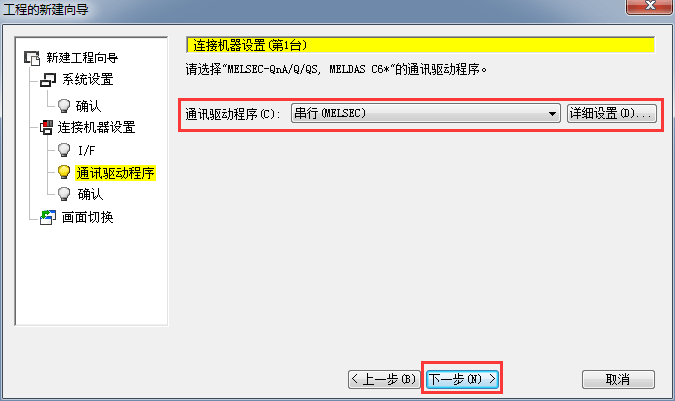 2.1.6 設(shè)置通訊啟動驅(qū)動,(串行MELSEC)默認,后單擊[下一步]