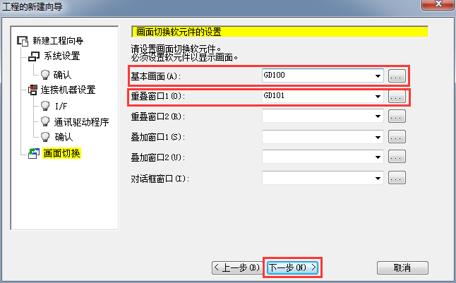 2.1.8 畫面切換軟元件設(shè)置,設(shè)置基本畫面和重疊窗口軟元件地址,后單擊[下一步]