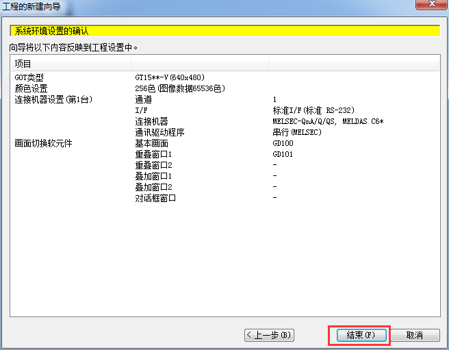 2.1.9 系統(tǒng)環(huán)境設(shè)置確認,單擊[結(jié)束],到此完成一個工程項目新建。