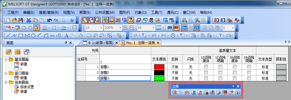 可添加注釋號,每個注釋號可編輯報警信息,也可以編輯報警信息屬性(如文本顏色)。