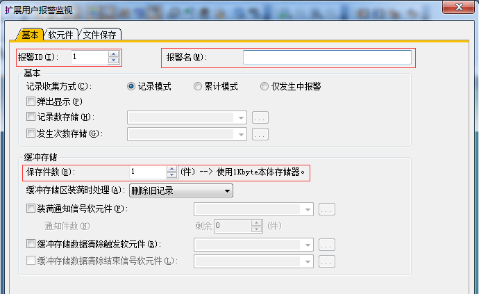 2.3.3 擴展用戶報警監(jiān)視-基本設(shè)置,設(shè)置報警ID及名稱,一般默認1,報警名可自定義,保存件數(shù)(設(shè)置與報警點數(shù)相同)可增加,用于報警存放報警點數(shù)。