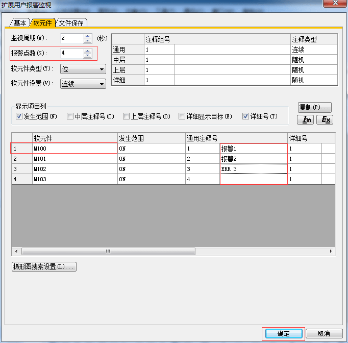 2.3.3 擴展用戶報警監(jiān)視-軟元件設(shè)置,設(shè)置完后單擊[確認]