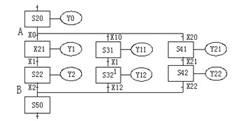 該狀態(tài)轉(zhuǎn)移圖有三個(gè)流程圖,S20為分支狀態(tài) ,根據(jù)不同的條件( X0,X10,X20), 選擇執(zhí)行其中一個(gè)條件滿(mǎn)足的流程。 X0,X10,X20不能同時(shí)為ON,S50為匯合狀態(tài),可由S22、S32、S42任一狀態(tài)驅(qū)動(dòng)。